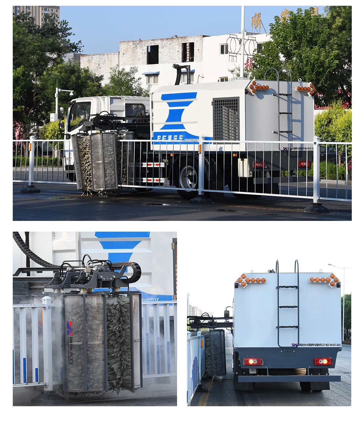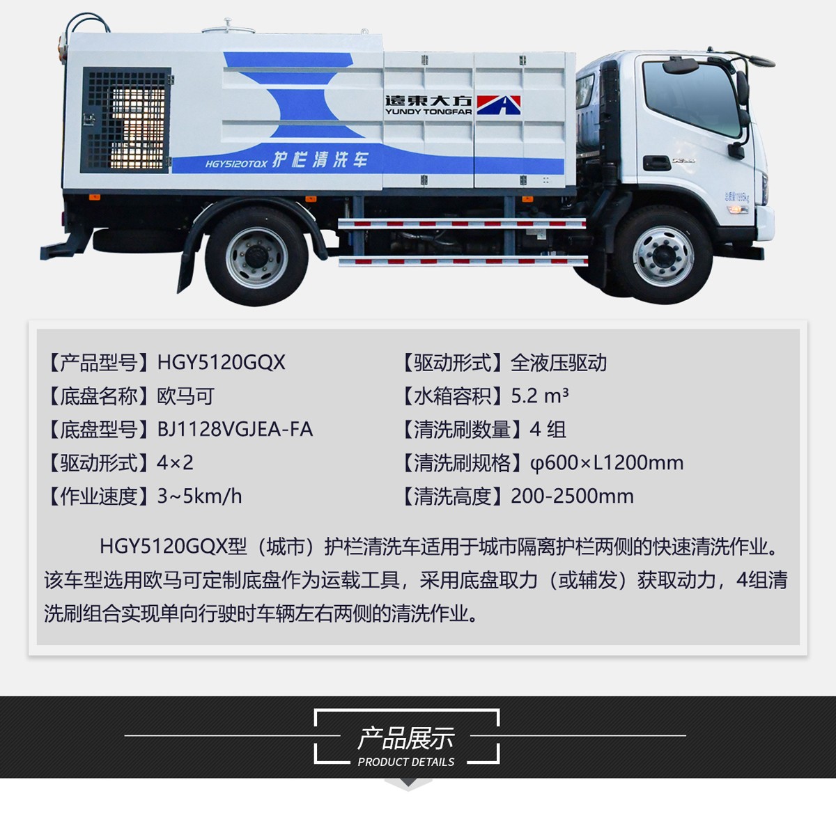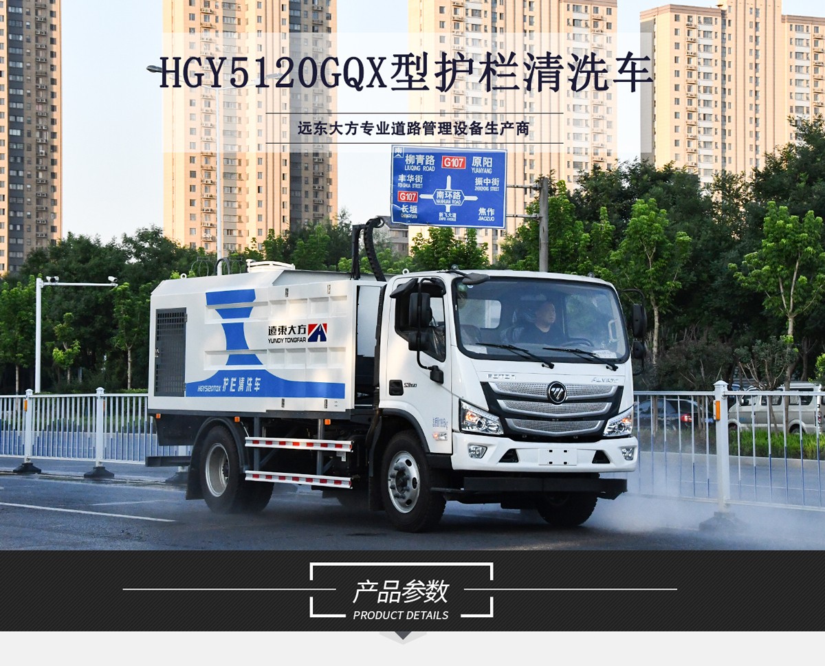 HGY5120GQX型(城市)護欄清洗車適用於城(chéng)市隔離護欄兩側的快(kuài)速清洗(xǐ)作業。該車型選用歐馬可定製底盤(pán),全液壓驅動,多組清洗(xǐ)刷組合實現單向行駛時車輛左右兩側的清(qīng)洗作業。